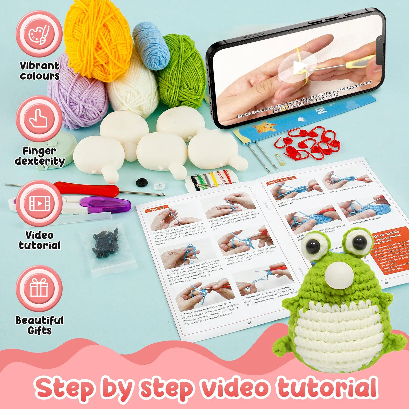 Say goodbye to the confusion of starting a new craft. Our kit comes with easy-to-understand instructions and quality tools that make crochet accessible and enjoyable. Marker buttons, large head needles, and a double head crochet hook transform daunting yarn into delightful creations!